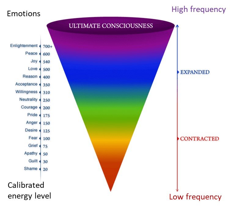 According to the human consciousness theory proposed by David R. Hawkins, human consciousness can be measured on a scale from 0 to 1000, with higher levels of consciousness representing higher states of awareness and spiritual enlightenment. Emotions are associated with specific energy levels on this scale.